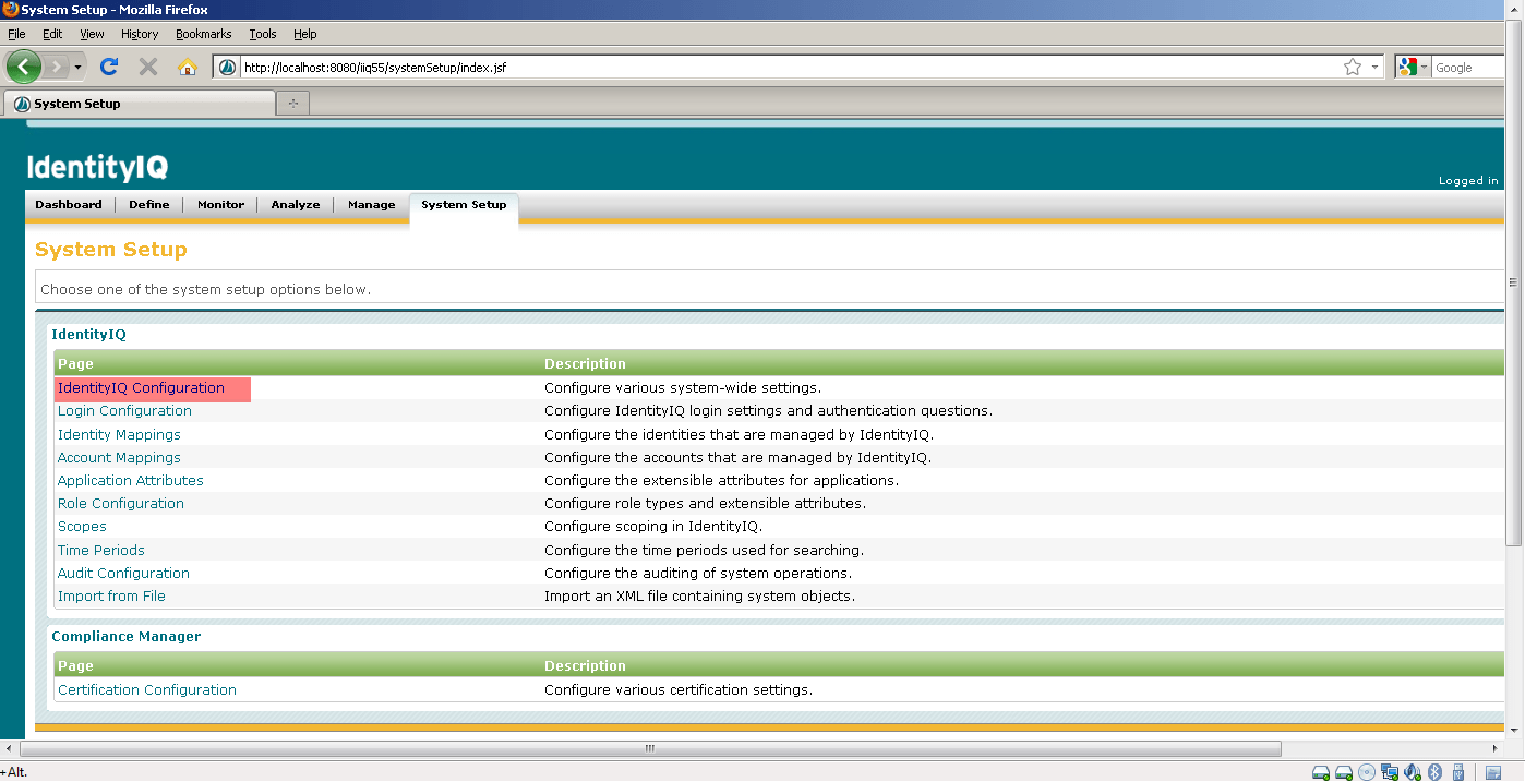2.Select the System Setup Tab. On the System Setup Page select IdentityIQ Configuration